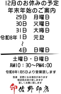 12月 お店のお休みのお知らせになります どうぞ 宜しくお願い致します
